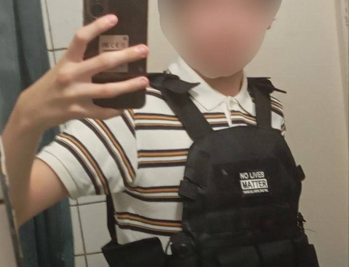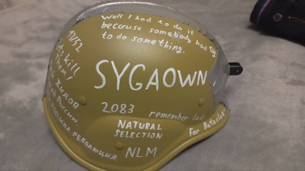 Так же нападавший был в каске, разрисованной экстремистскими цитатами и названиями праворадикальных организаций. На ней нанесено слово «Sygaown» — отсылка к массовому расстрелу в США в 2022 году.