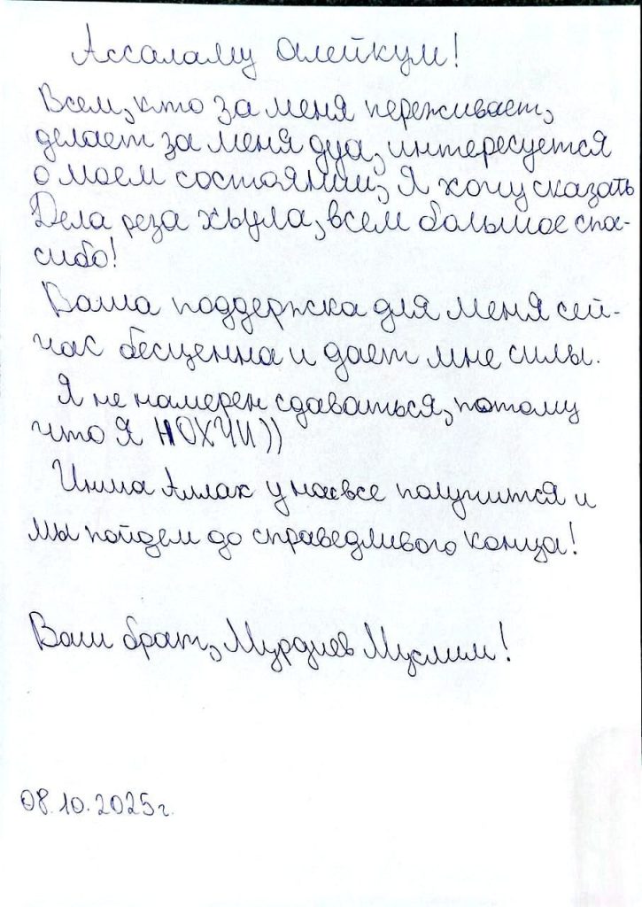Муслим Мурдиев написал письмо всем, кто его поддерживает. Вот полный текст письма: