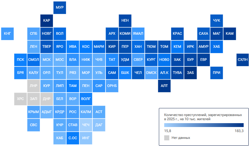 Регионами с наиболее высоким уровнем преступности, по данным МВД, стали Карелия и Забайкальский край. Там число зарегистрированных преступлений оказалось самым большим в пересчете на численность населения.